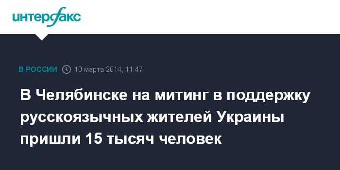 Москва. 10 марта. INTERFAX.RU - Митинг в поддержку русскоговорящих жителей Украины собрал в центре Челябинска 15 тысяч человек, сообщили "Интерфаксу" в понедельник в пресс-службе ГУ МВД по Челябинской области. "Нарушений общественного порядка на митинге не зафиксировано. Он прошел без происшествий", - сказал представители региональной полиции.