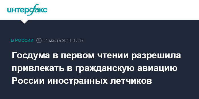 Москва. 11 марта. INTERFAX.RU - Госдума во вторник приняла в первом чтении правительственный законопроект, разрешающий привлекать иностранцев для работы в составе экипажей воздушных судов гражданской авиации.