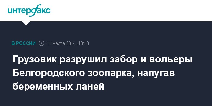 Белгород. 11 марта. INTERFAX.RU - Сотрудники Белгородского зоопарка разыскивают очевидцев ДТП, в результате которого неизвестный грузовик разбил несколько секций кирпичного забора, снес металлическую решетку, ограждающую зоопарк со стороны оживленной улицы, разрушил три вольера для животных и скрылся.