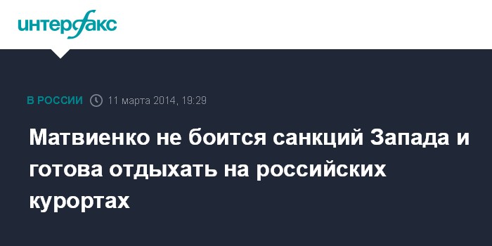 В случае введения визовых санкций Евросоюзом и другими странами Запада в отношении российских чиновников в связи с позицией Москвы по ситуации на Украине и, в частности, в Крыму, Матвиенко готова отдыхать на Родине. "У нас есть прекрасные курорты, где мы можем отдыхать. Мест отдыха в России очень много, и эти места замечательные. Будем ездить отдыхать в Сочи", - отметила Матвиенко.