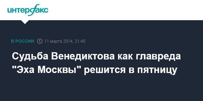 Москва. 11 марта. INTERFAX.RU - Заочное заседание совета директоров "Эхо Москвы" по утверждению кандидатуры главного редактора радиостанции состоится 14 марта.