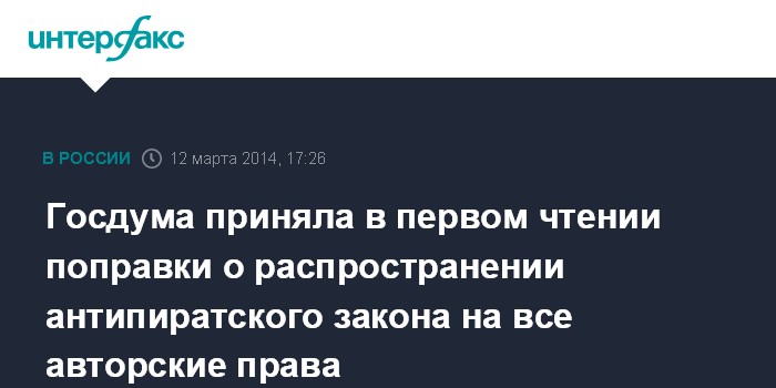 Москва. 12 марта. INTERFAX.RU - Госдума на пленарном заседании в среду приняла в первом чтении законопроект, которым предлагается распространить действие принятого и вступившего ранее в силу антипиратского закона на все объекты авторских и смежных прав, а не только на фильмы.