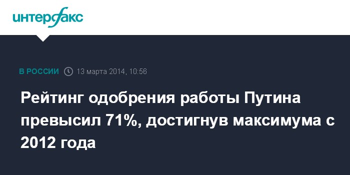 Москва. 13 марта. INTERFAX.RU - Рейтинг одобрения деятельности президента РФ Владимира Путина достиг максимального значения за последние несколько лет - 71,6%, свидетельствуют результаты исследования ВЦИОМ.
