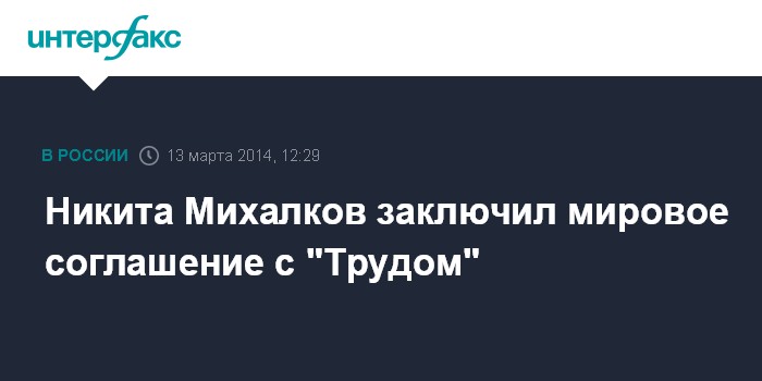Москва. 13 марта. INTERFAX.RU - Тверской суд Москвы утвердил мировое соглашение по иску режиссера Никиты Михалкова к редакции газеты "Труд" за распространенные сведения о якобы его причастности к махинациям с контрактами на поставку бриллиантов.