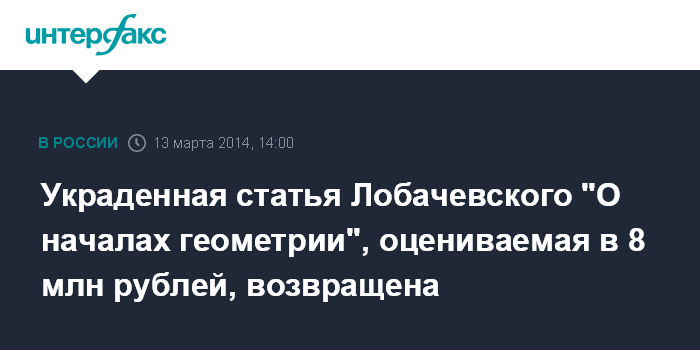 Украденная статья Лобачевского "О началах геометрии", оцениваемая в 8 млн рублей, возвращена