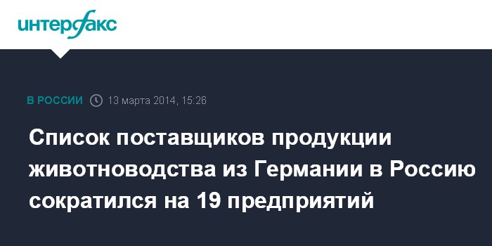 Это сделано по просьбе управления по здоровью и защите животных министерства продовольствия, сельского хозяйства и защиты прав потребителей Германии. Управление попросило исключить 19 предприятий из числа поставщиков продукции животноводства в РФ из-за их несоответствия ветеринарно-санитарным требованиям и нормам Таможенного союза и России.