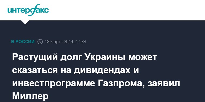 Берлин. 13 марта. INTERFAX.RU - Растущий долг Украины за поставки газа может сказаться на дивидендах и инвестиционной программе "Газпрома", заявил глава "Газпрома" Алексей Миллер.