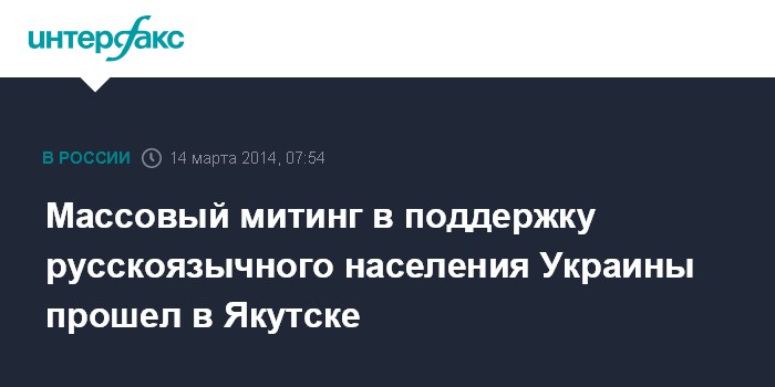 Якутск. 14 марта. INTERFAX.RU - Митинг в поддержку русскоязычного населения Украины и жителей Крыма собрал более 2 тыс. человек, сообщает корреспондент агентства "Интерфакс-Дальний Восток" с митинга в пятницу.