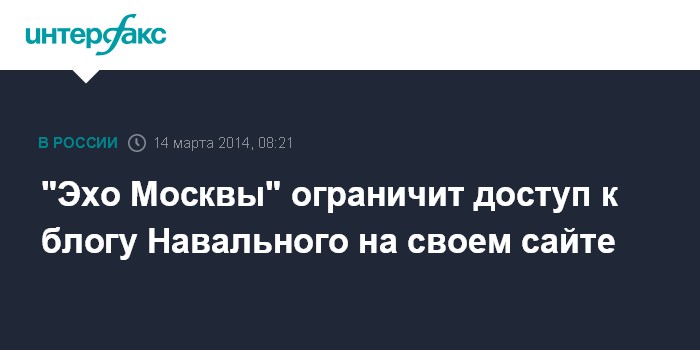 Москва. 14 марта. INTERFAX.RU - Сайт "Эхо Москвы" ограничит доступ к блогам оппозиционера Алексея Навального по предписанию Роскомнадзора и Генпрокуратуры РФ, юристы радиостанции подготовят материалы в суды в связи с отключением сайта некоторыми провайдерами, сообщил главный редактор "Эха Москвы" Алексей Венедиктов.