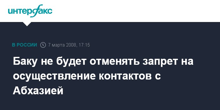 Баку. 7 марта. INTERFAX.RU - Азербайджан не будет выходить из режима запрета на осуществление торгово-экономических, финансовых, транспортных и иных связей с Абхазией по государственной линии, заявил агентству "Интерфакс-Азербайджан" пресс-секретарь МИД республики Хазар Ибрагим.