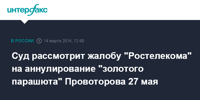 Москва. 14 марта. INTERFAX.RU - Тринадцатый арбитражный апелляционный суд (Санкт-Петербург) назначил на 27 мая рассмотрение апелляционной жалобы ОАО "Ростелеком" на решение суда первой инстанции о признании незаконным "золотого парашюта" экс-президента компании Александра Провоторова.