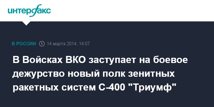 "Таким образом, в настоящее время в Войсках воздушно-космической обороны боевое дежурство по противовоздушной обороне Москвы и Центрального промышленного района несут уже три зенитных ракетных полка, укомплектованные новейшими ЗРС С-400 "Триумф" и ЗРПК "Панцирь-С", - сказал "Интерфаксу" официальный представитель управления пресс-службы и информации Минобороны по Войскам ВКО полковник Алексей Золотухин.