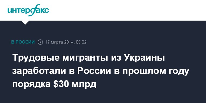 Москва. 17 марта. INTERFAX.RU - Трудовые мигранты из Украины заработали в России в прошлом году несколько десятков долларов США, сообщил глава Федеральной миграционной службы РФ Константин Ромодановский.
