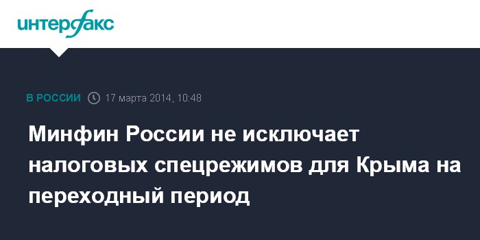 Москва. 17 марта. INTERFAX.RU - Минфин РФ не исключает введение специальных налоговых режимов для Крыма на переходный период, если полуостров будет включен в состав России.