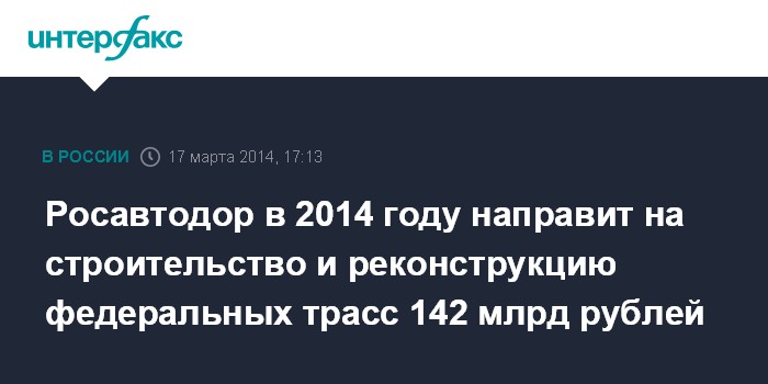 Москва. 17 марта. INTERFAX.RU - Федеральное дорожное агентство (Росавтодор) в 2014 году направит на строительство и реконструкцию участков федеральных автомобильных дорог общего пользования 141,9 млрд рублей, говорится в сообщении агентства.