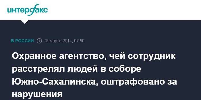 Москва. 18 марта. INTERFAX.RU - Южно-Сахалинское охранное агентство "Центурия", в котором работал расстрелявший 9 февраля 2014 года в Воскресенском соборе прихожан Степан Комаров, оштрафовано на 60 тыс. рублей за нарушения законодательства о частной охранной деятельности и оружии.