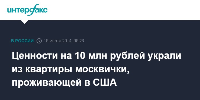 Москва. 18 марта. INTERFAX.RU - Квартиру москвички, живущей в США, обокрали на западе столицы, похитив ценностей на 10 млн рублей, сообщили "Интерфаксу" во вторник в пресс-службе ГУ МВД России по Москве.