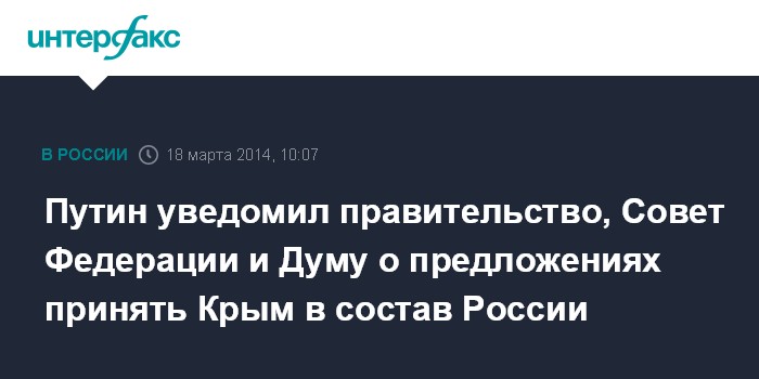 Москва. 18 марта. INTERFAX.RU - Президент России Владимир Путин уведомил Совет Федерации, Госдуму и правительство о предложениях государственного совета Крыма и законодательного собрания города Севастополя о принятии в РФ Республики Крым, включая город Севастополь, и образовании в составе Российской Федерации новых субъектов, сообщает во вторник пресс-служба Кремля.