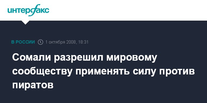 Москва. 1 октября. INTERFAX.RU - Международное сообщество имеет право применять силовые меры против захваченных сомалийскими пиратами судов. Такое заявление министерства иностранных дел Сомали приводит в среду британский телеканал Sky news.