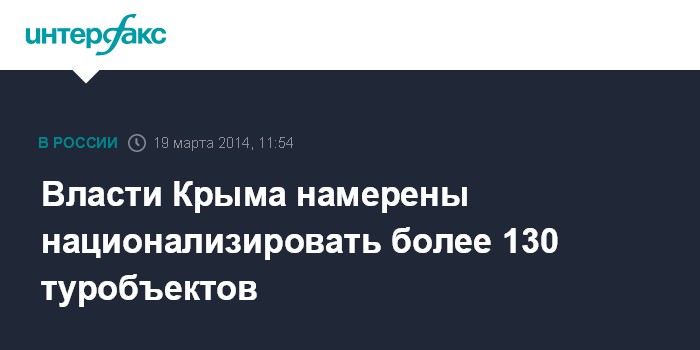 Москва. 19 марта. INTERFAX.RU - Крымские власти национализируют туристические объекты, находившиеся в собственности Украины, при этом средств размещения, находящихся в частной собственности, изменения не коснутся, отмечается в размещенном в среду на сайте Российского союза туриндустрии (РСТ) сообщении со ссылкой на министра курортов и туризма Республики Крым Елену Юрченко.