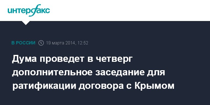 Москва. 19 марта. INTERFAX.RU - В Госдуме подтверждают, что в четверг состоится дополнительное заседание, где, как ожидается, будет ратифицирован договор о вступлении Крыма в РФ.