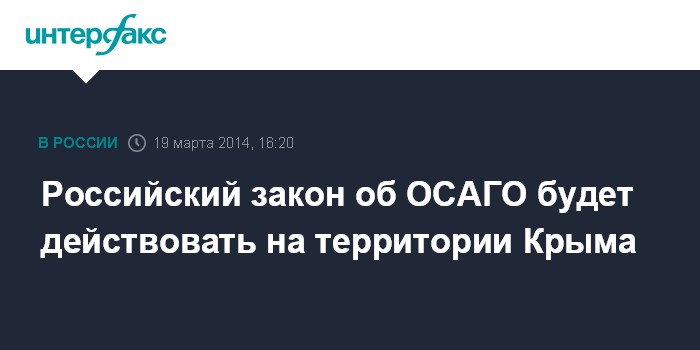Москва. 19 марта. INTERFAX.RU - Российский закон об ОСАГО начнет действовать на территории Крыма после того, как решение о присоединении республики к России будет ратифицировано и российское законодательство начнет действовать в Республике Крым, сообщил руководитель департамента страхового рынка Центробанка РФ Игорь Жук на пресс-конференции в среду.