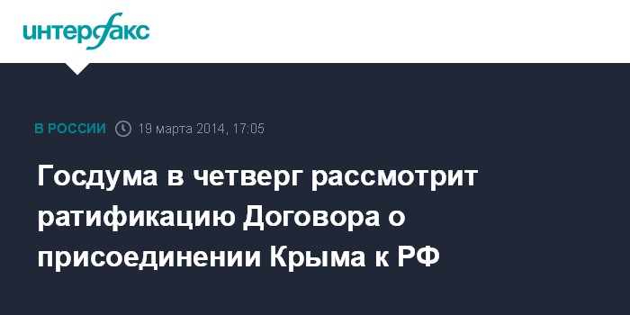 Госдума в четверг рассмотрит ратификацию Договора о присоединении Крыма к РФ