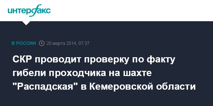 Москва. 20 марта. INTERFAX.RU - Следственные органы СКР по Кемеровской области проводят доследственную проверку по факту гибели проходчика на шахте ОАО "Распадская", говорится в сообщении областного СУ СКР.