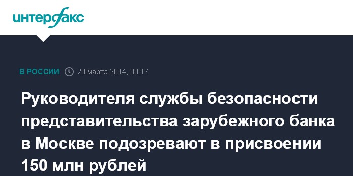 Руководителя службы безопасности представительства зарубежного банка в Москве подозревают в присвоении 150 млн рублей