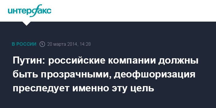 "Наша принципиальная позиция состоит в следующем: российские компании должны быть зарегистрированы на территории нашей страны и иметь прозрачную структуру собственности. Именно поэтому поставлена задача по деофшоризации отечественной экономики", - сказал Путин, выступая на съезде РСПП.