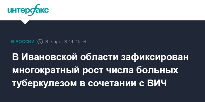 Москва. 20 марта. INTERFAX.RU - За 8 лет в Ивановской области почти в 85 раз выросло число больных с сочетанием туберкулеза и ВИЧ-инфекции, сообщил начальник регионального департамента здравоохранения Михаил Ратманов на пресс-конференции в ивановском пресс-центре "Интерфакса" в четверг.