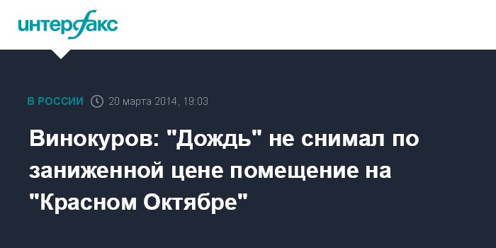 Москва. 20 марта. INTERFAX.RU - Инвестор телеканала "Дождя" Александр Винокуров опроверг появившиеся в СМИ сообщения о том, что телеканал арендовал помещение на фабрике "Красный Октябрь" по заниженным ценам.