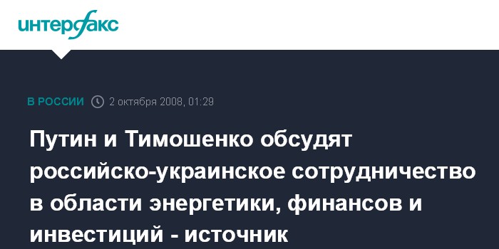 Путин и Тимошенко обсудят российско-украинское сотрудничество в области энергетики, финансов и инвестиций - источник