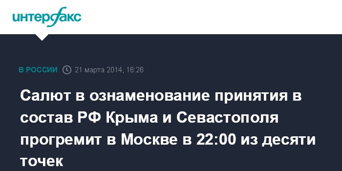 Москва. 21 марта. INTERFAX.RU - В ознаменование принятия в состав Российской Федерации Республики Крым и города Севастополь в Москве в пятницу в 22:00 будет произведен праздничный салют.