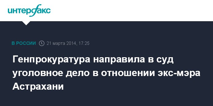 Москва. 21 марта. INTERFAX.RU - Генеральная прокуратура России направила в суд уголовное дело в отношении бывшего мэра Астрахани Михаила Столярова, который обвиняется в получении взятки в особо крупном размере - 10 млн рублей.
