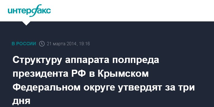 Москва. 21 марта. INTERFAX.RU - Глава администрации президента РФ в трехдневный срок должен утвердить структуру и штатную численность аппарата полпреда в Крымском Федеральном округе.