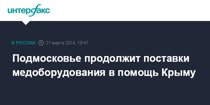 Красногорск. 21 марта. INTERFAX.RU - По поручению губернатора Московской области Андрея Воробьева, поставки медоборудования из Подмосковья в Крым продолжатся, сообщила "Интерфаксу" министр здравоохранения региона Нина Суслонова.
