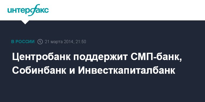 Москва. 21 марта. INTERFAX.RU - ЦБ РФ сообщает о готовности поддержать СМП-банк, Собинбанк и Инвесткапиталбанк в случае необходимости защиты интересов вкладчиков и кредиторов.