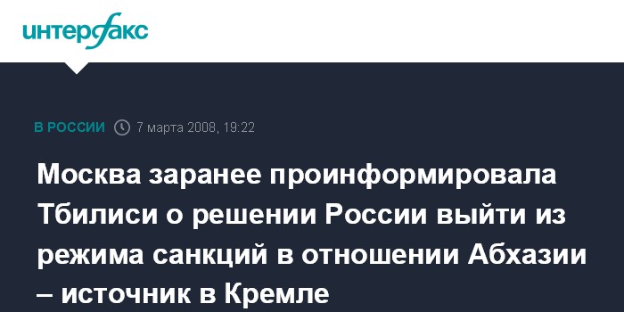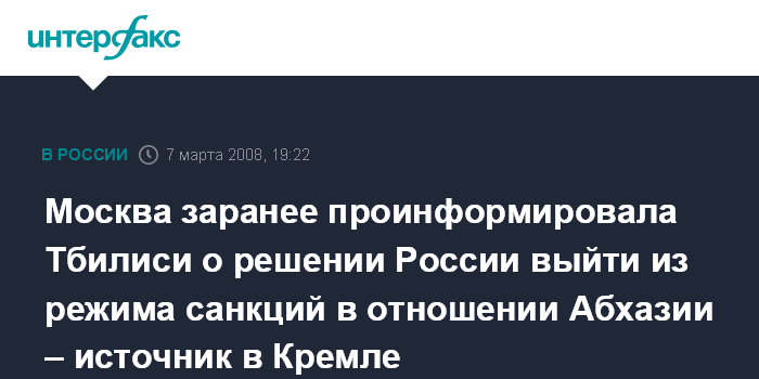 Москва заранее проинформировала Тбилиси о решении России выйти из режима санкций в отношении Абхазии – источник в Кремле