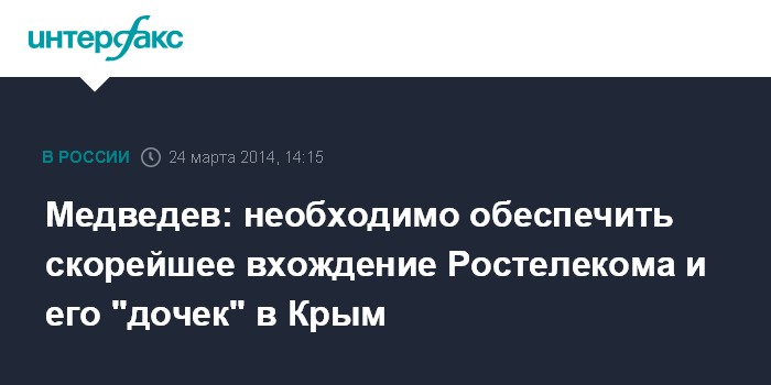 Москва. 24 марта. INTERFAX.RU - Премьер министр России Дмитрий Медведев призывает обеспечить в короткие сроки присутствие "Ростелекома" и его дочерних предприятий в Крыму.