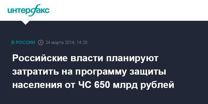 Москва. 24 марта. INTERFAX.RU - Свыше 650 млрд рублей может быть направлено до 2017 года на защиту населения России от чрезвычайных ситуацией и обеспечения пожарной безопасности.