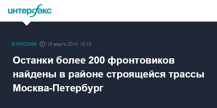 Москва. 24 марта. INTERFAX.RU - Сотрудники петербургского инженерно-технического центра спецработ и бойцы новгородской поисковой экспедиции "Долина" нашли останки более 200 фронтовиков при обследовании участка трассы высокоскоростной магистрали М-11 Москва-Санкт-Петербург в Новгородской и Ленинградской областях, сообщил в понедельник "Интерфаксу" представитель штаба экспедиции.
