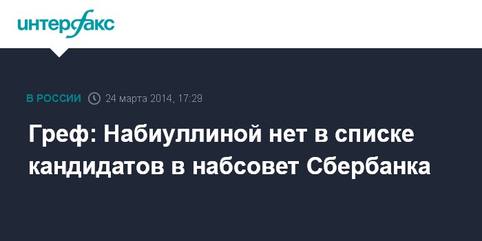 Москва. 24 марта. INTERFAX.RU - Председатель ЦБ РФ Эльвира Набиуллина не вошла в список кандидатов в наблюдательный совет Сбербанка России (MOEX: SBER), заявил президент - председатель правления Сбербанка Герман Греф на пресс-конференции в понедельник.