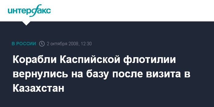 Москва. 2 октября. INTERFAX.RU - Флагман Каспийской флотилии-ракетный корабль "Татарстан" и гидрографическое судно "Анатолий Гужвин" завершили визит в казахстанский порт Актау и вернулись на базу, сообщил "Интерфаксу-АВН" в четверг помощник командующего Каспийской флотилией Игорь Сидоров.