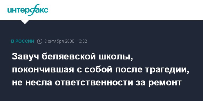 "Учительница, покончившая сегодня жизнь самоубийством, никаким образом не была связана с организацией и проведением ремонтных работ в школе. Отсюда можно сделать выводы, что ее вины в произошедшем быть не может", - сказала Линькова.