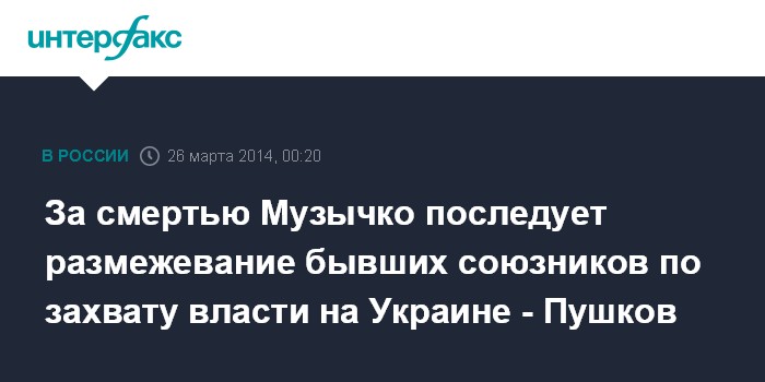 «История с Музычко - только начало. Сейчас будет размежевание бывших союзников по захвату власти. Таков закон любого переворота. Ждите новостей», - написал А.Пушков в своем микроблоге в «Твиттер».