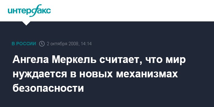 Санкт-Петербург. 2 октября. INTERFAX.RU - Канцлер Германии Ангела Меркель высказалась за построение новой архитектуры безопасности в мире.