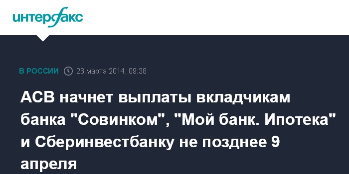 Москва. 26 марта. INTERFAX.RU - ГК "Агентство по страхованию вкладов" (АСВ) начнет выплату возмещения вкладчикам банка "Совинком", "Мой банк. Ипотека" и Сберинвестбанку не позднее 9 апреля 2014 года, говорится в сообщении АСВ.
