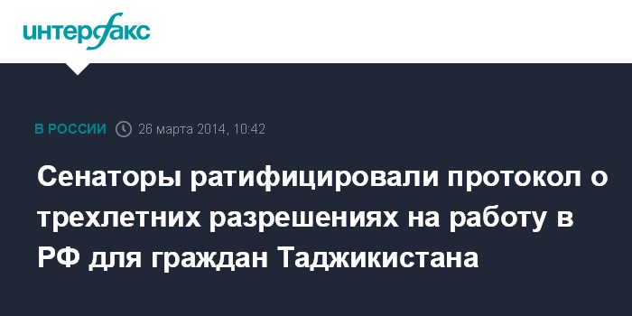 Москва. 26 марта. INTERFAX.RU - Совет Федерации одобрил ратификацию российско-таджикских договоренностей о возможности предоставления гражданам Таджикистана разрешения на работу в РФ на срок до трех лет.