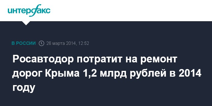 Москва. 26 марта. INTERFAX.RU - Федеральное дорожное агентство (Росавтодор) РФ оценивает ремонт дорог республики Крым и города Севастополя в 2014 году в размере 1,2 млрд рулей, сообщил журналистам глава ведомства Роман Старовойт.